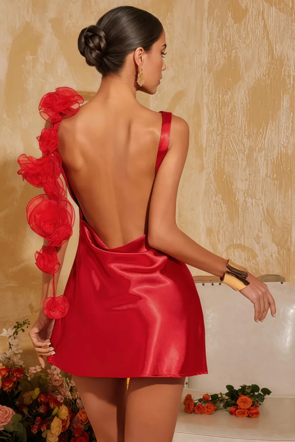 Ivoaed Backless Flower Satin Mini Dress