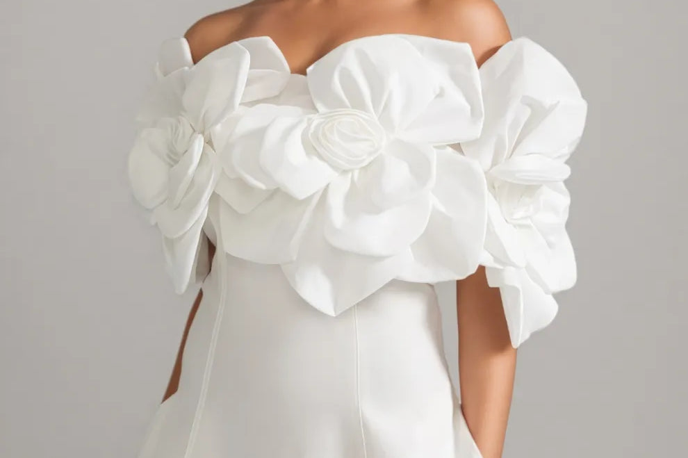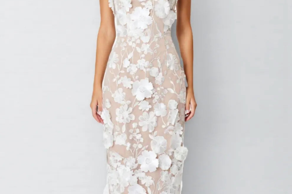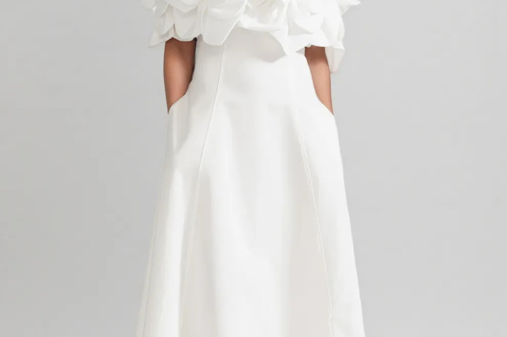 Linia Slant Shoulder 3D Floral Midi Dress-White