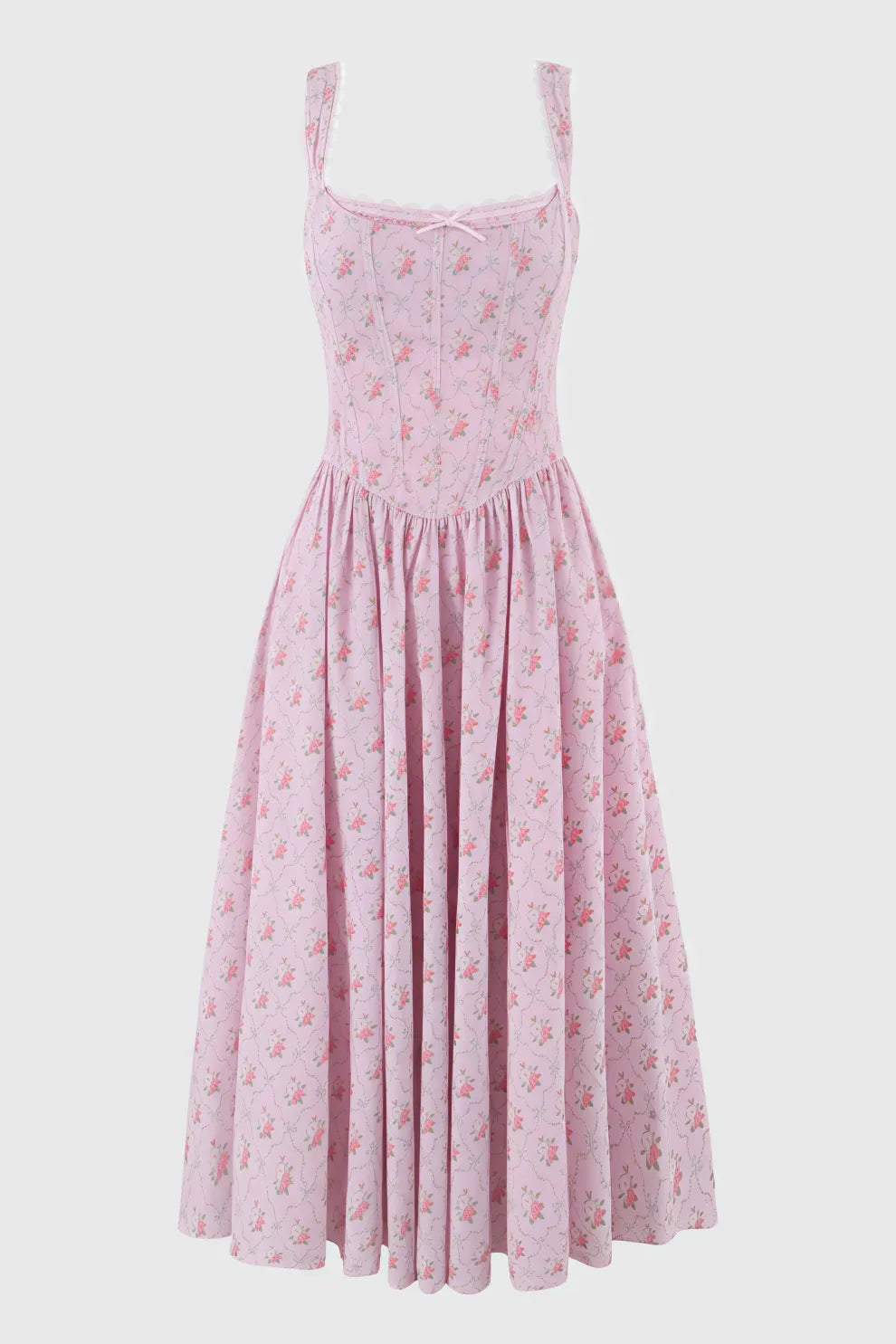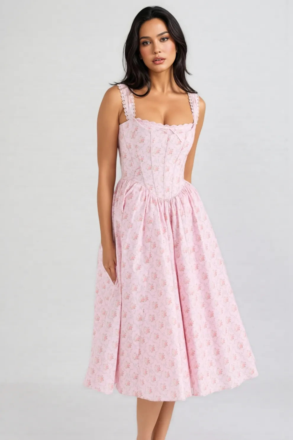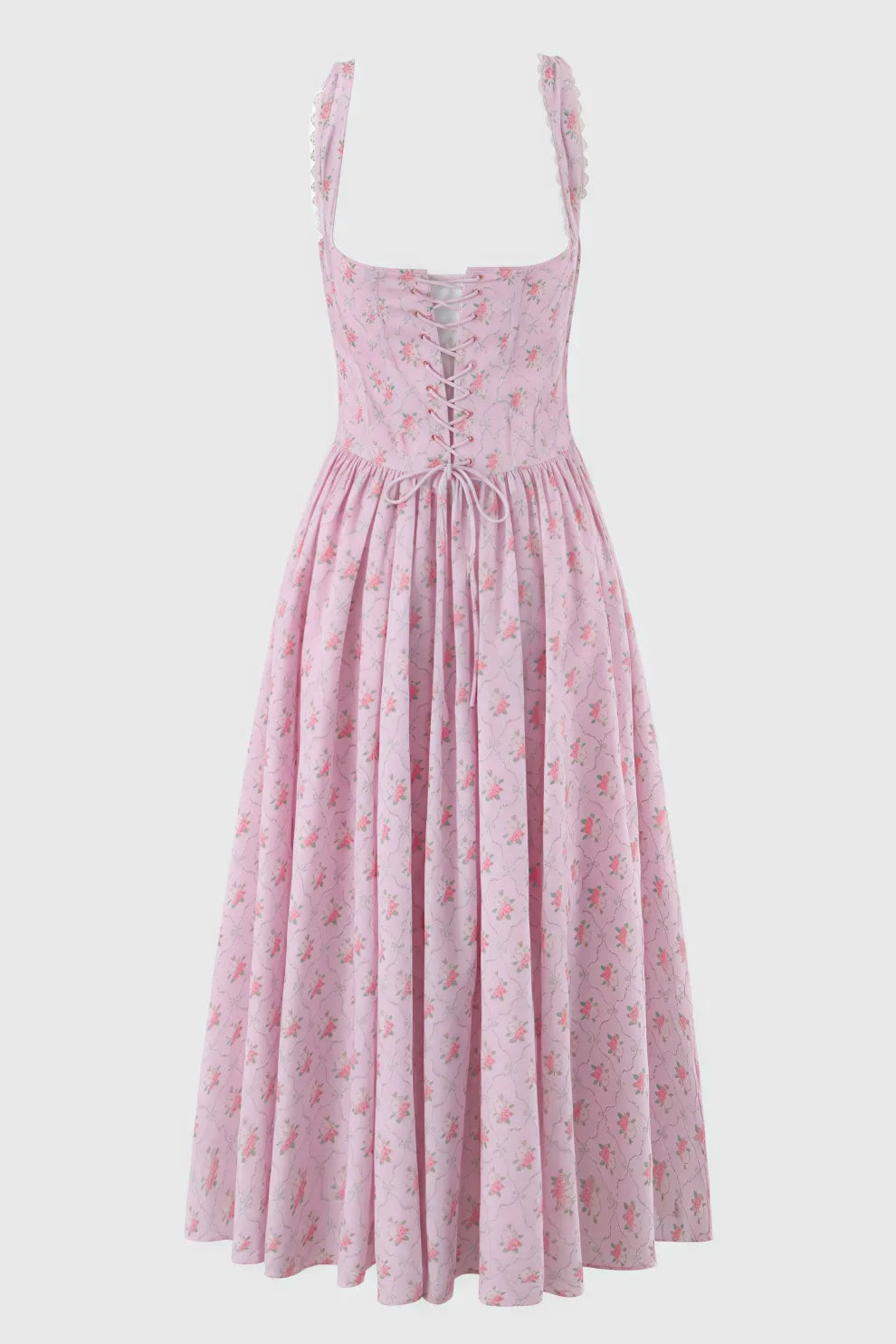 Arwent Pink Rose Print Stretch Cotton Midi Dress