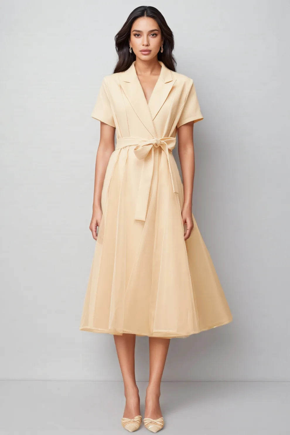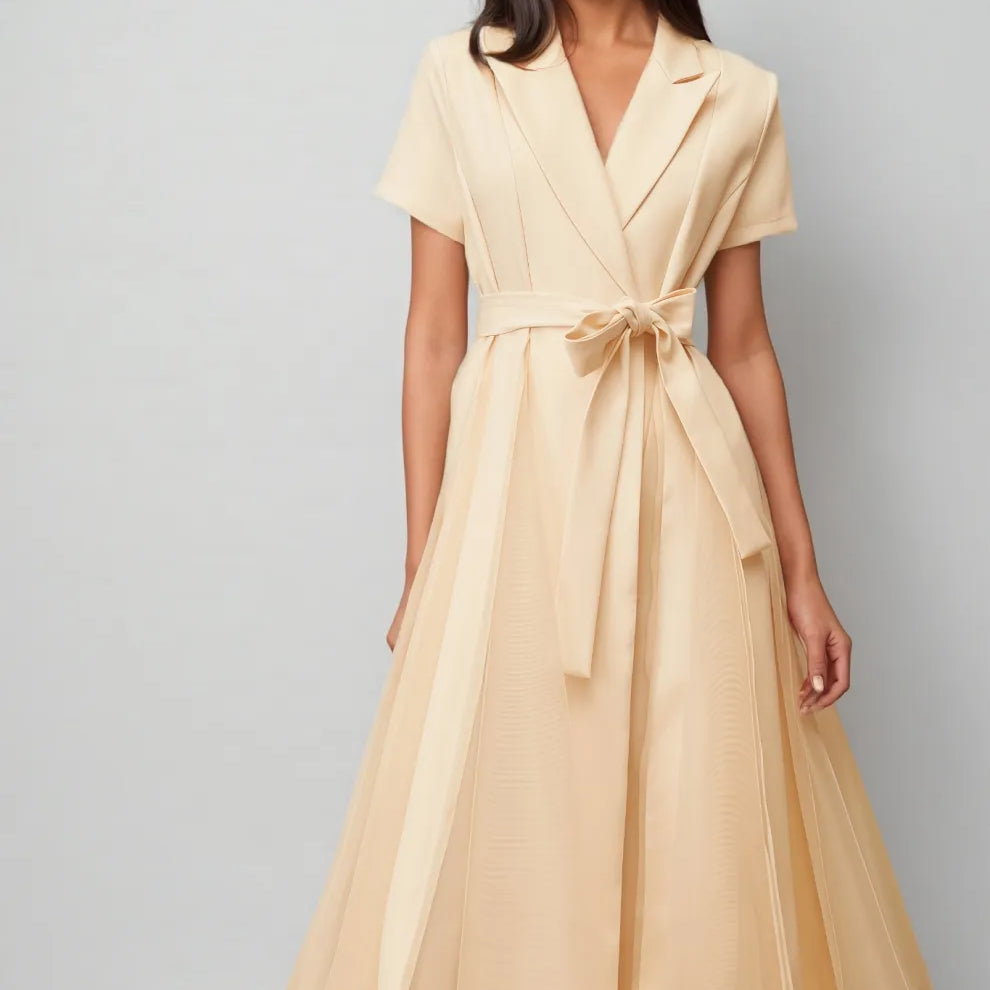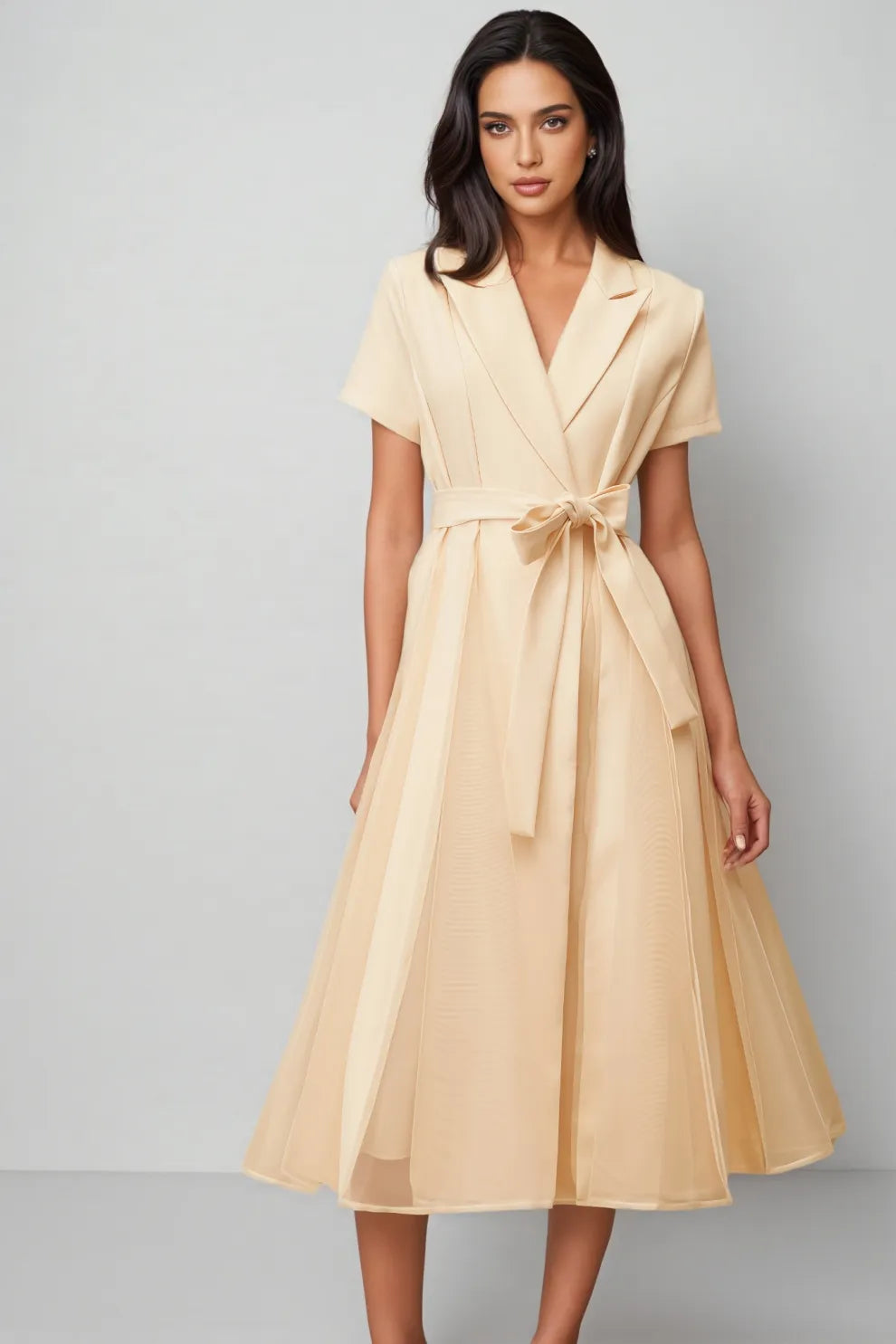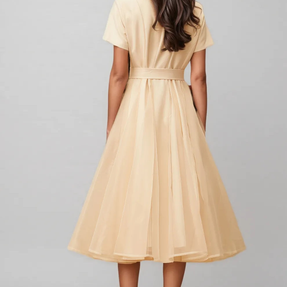 Ivonne Neutral Tulle Panel Wraped Midi Dress