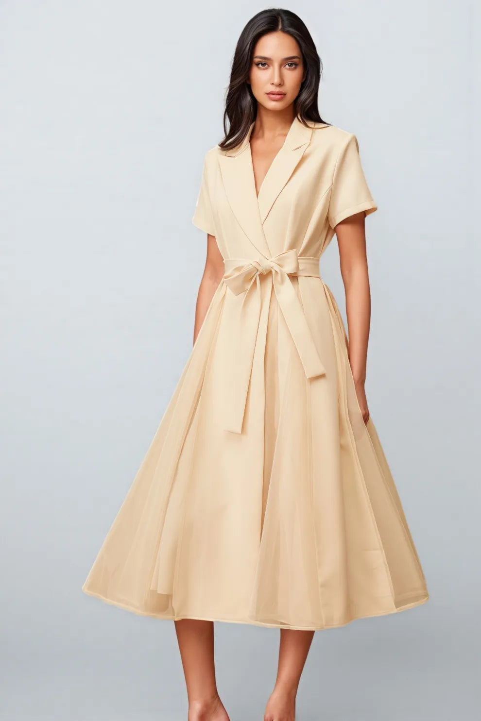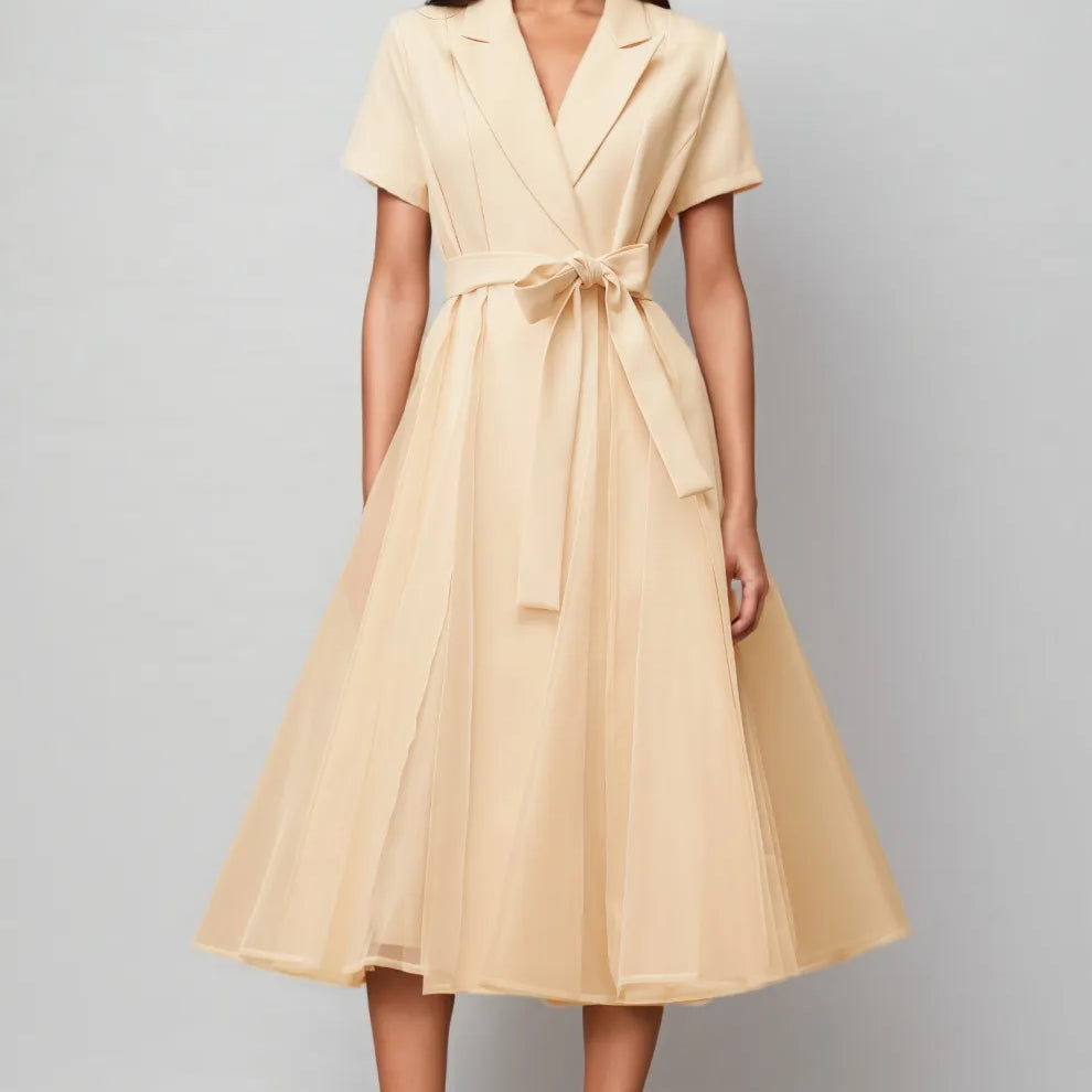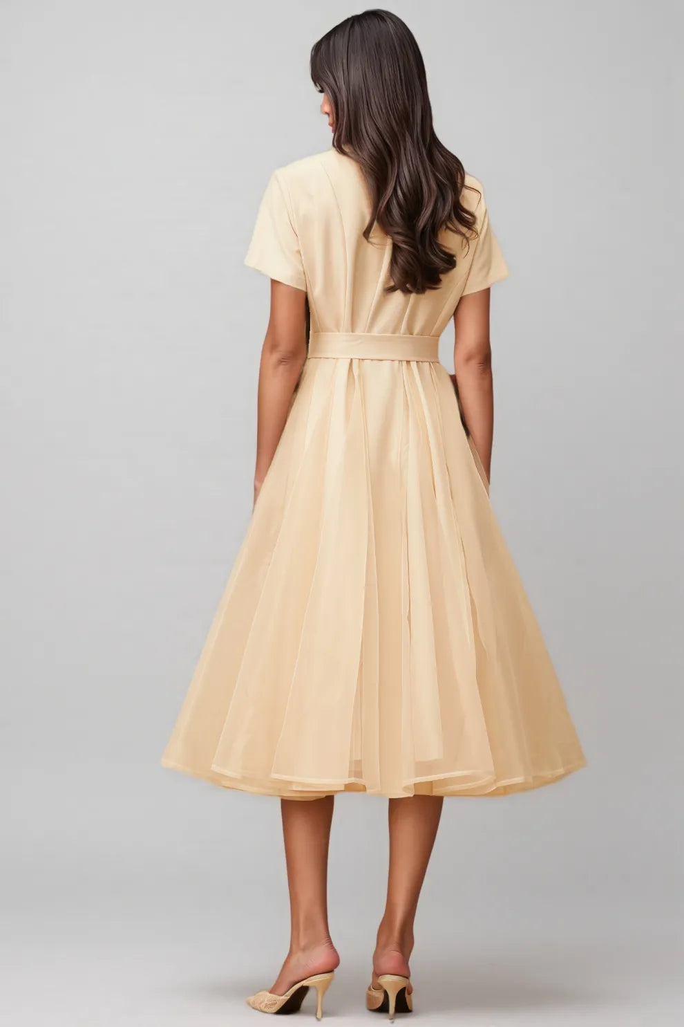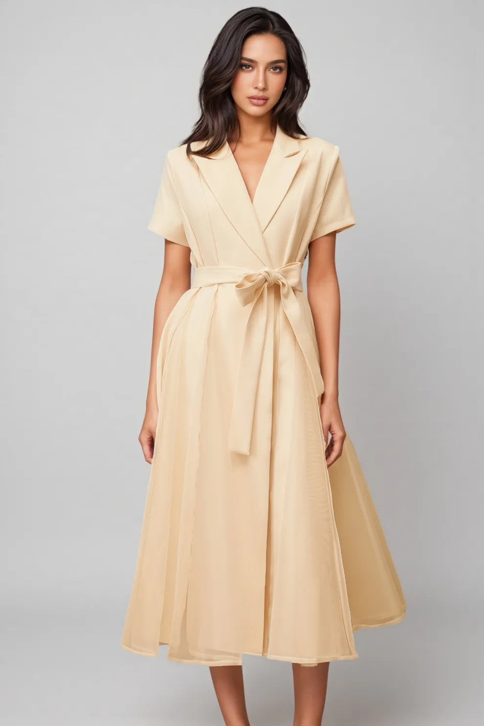 Ivonne Neutral Tulle Panel Wraped Midi Dress