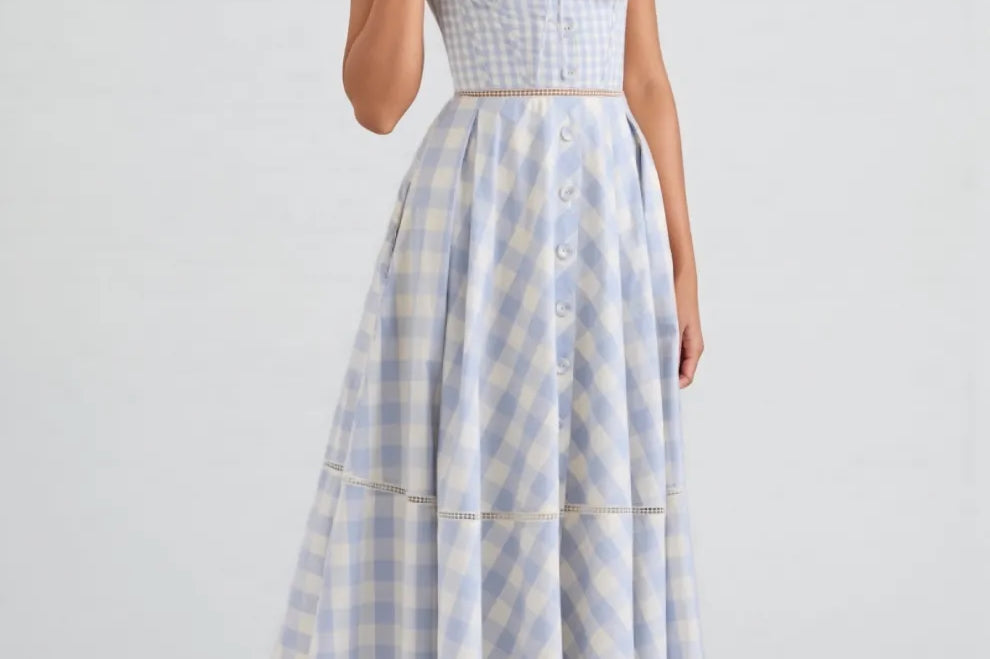 Azurt Blue Gingham Stretch Cotton Midi Dress Set