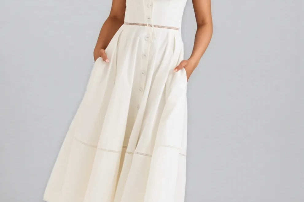 Kaelt White Cotton Button Front Midi Dress
