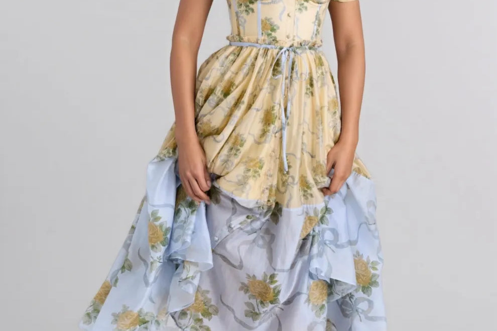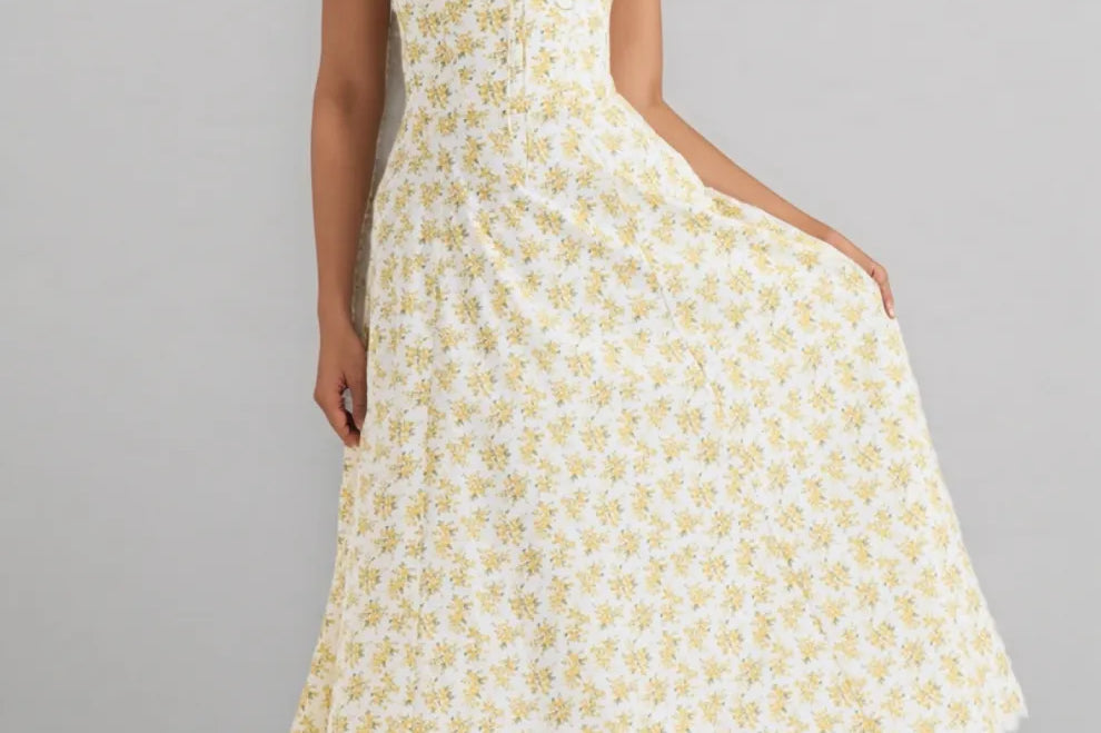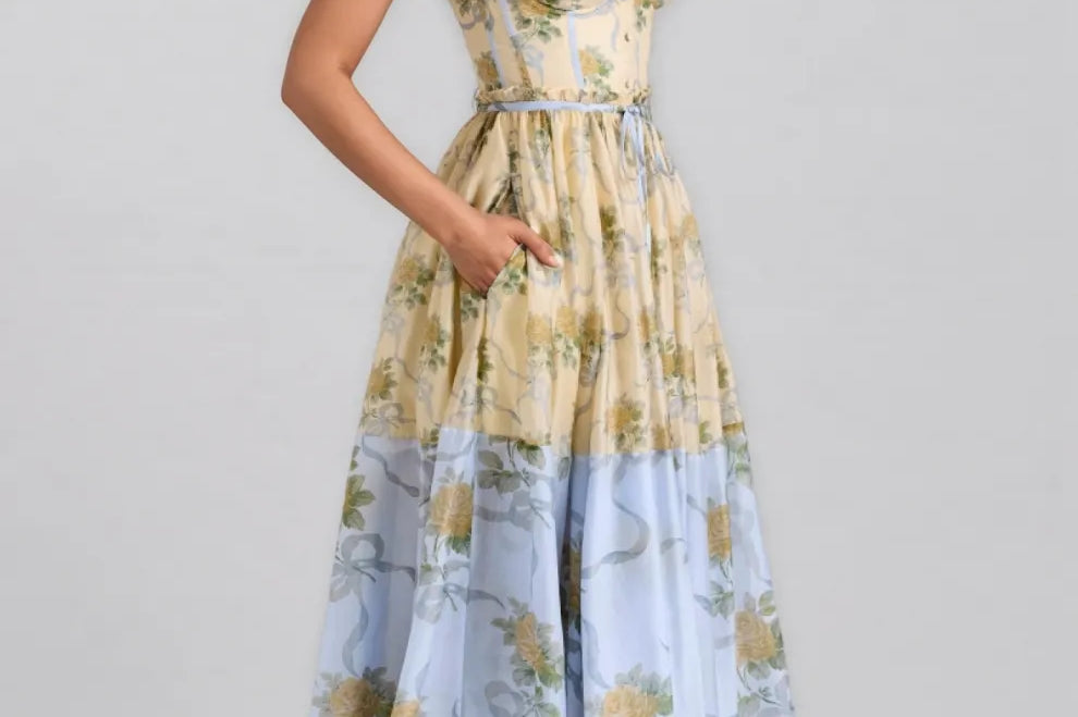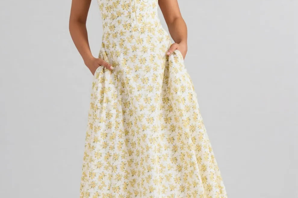 Elowen Yellow Vintage Rose Chiffon Midi Dress