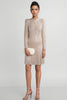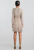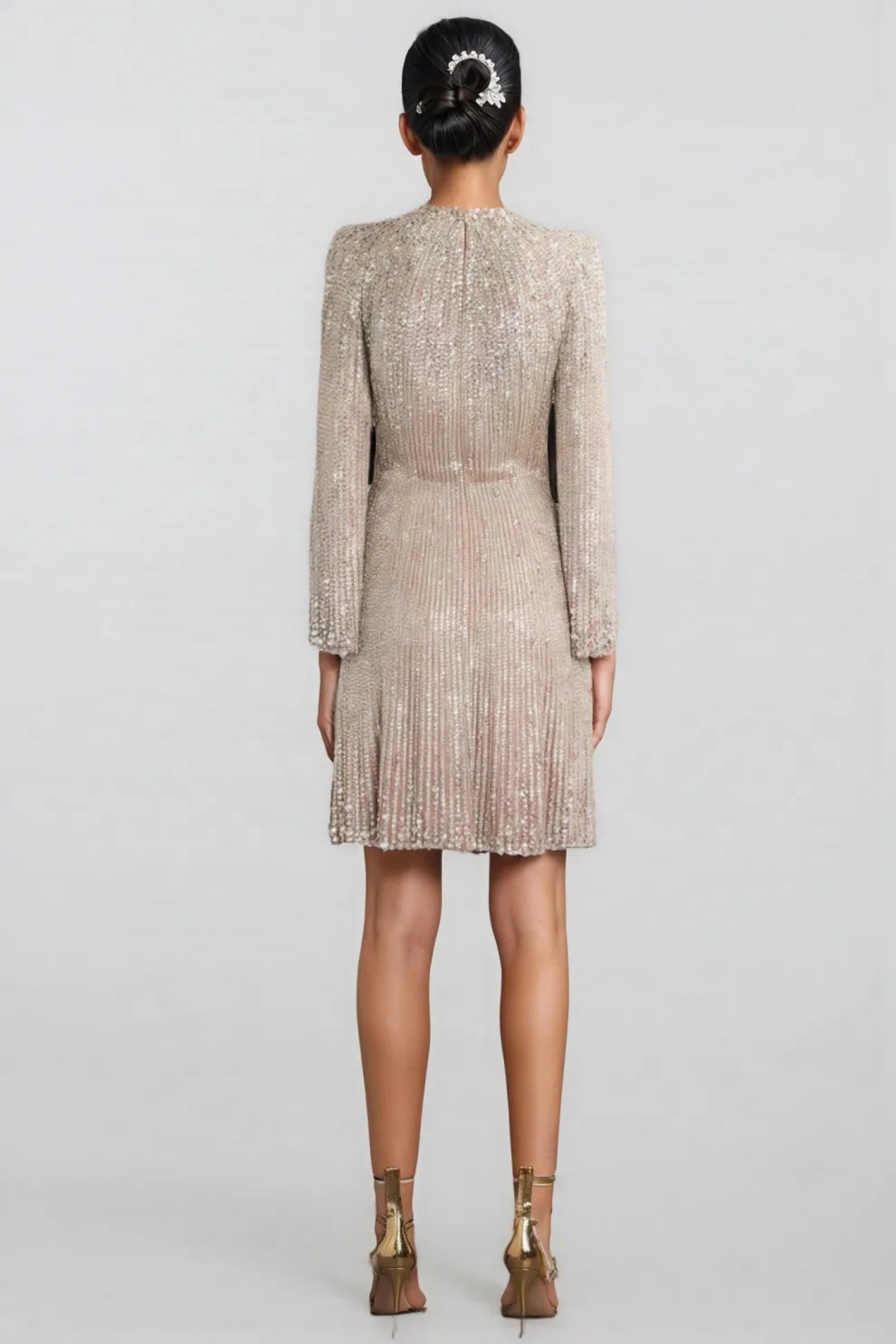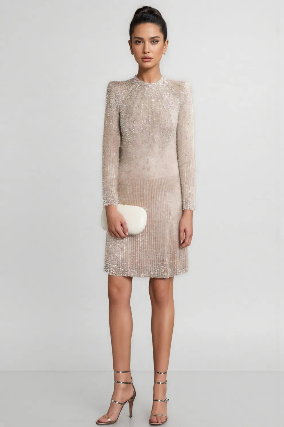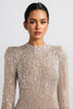 Ik wil een blije vrouw met een mooie jurk in beige achtergrond tinten