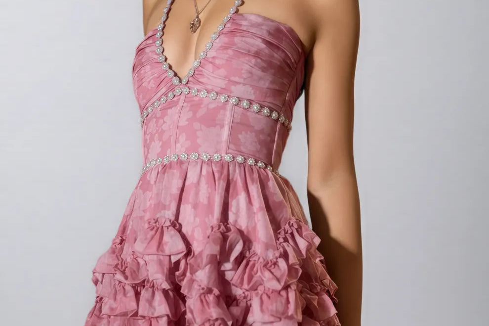 Tryphosa Pink Printed Beaded Mini Dress