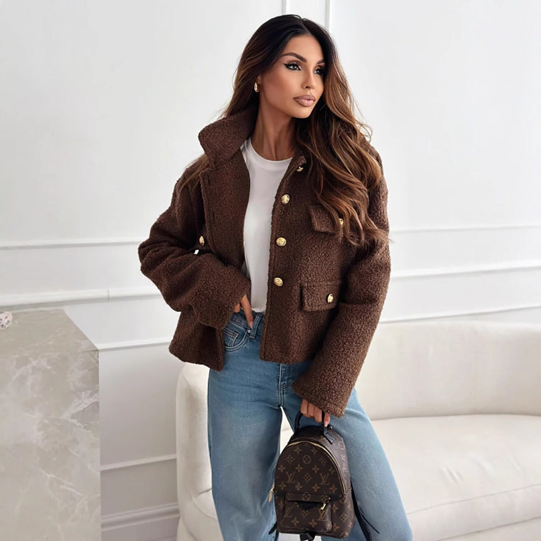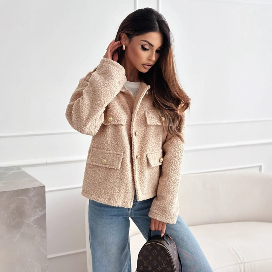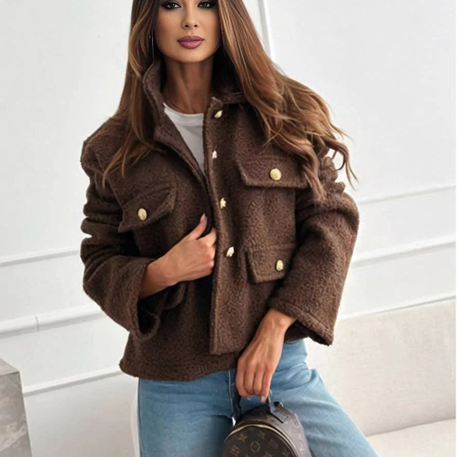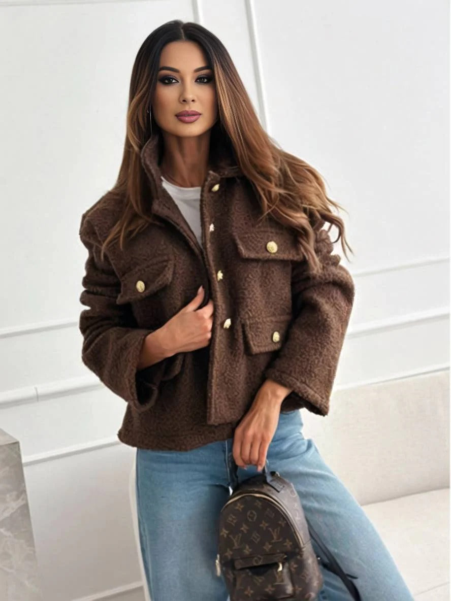Dames Jas – Relaxed Fit – Plush Textuur – Metalen Knopen – Borstzakken