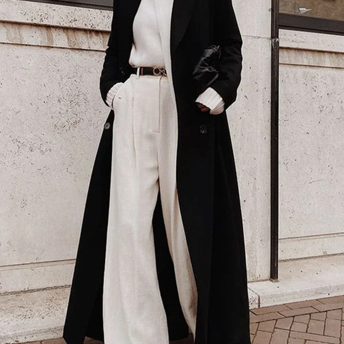 Dames Lange Jas – Wolblend – Relaxed Fit – Dubbel Rij Knopen – Notch Revers