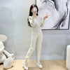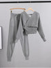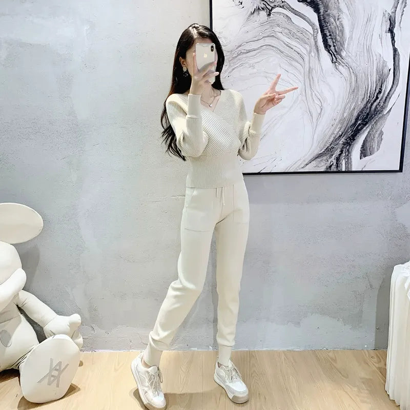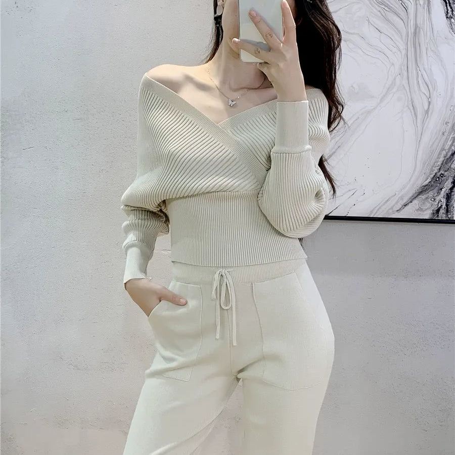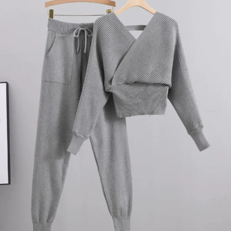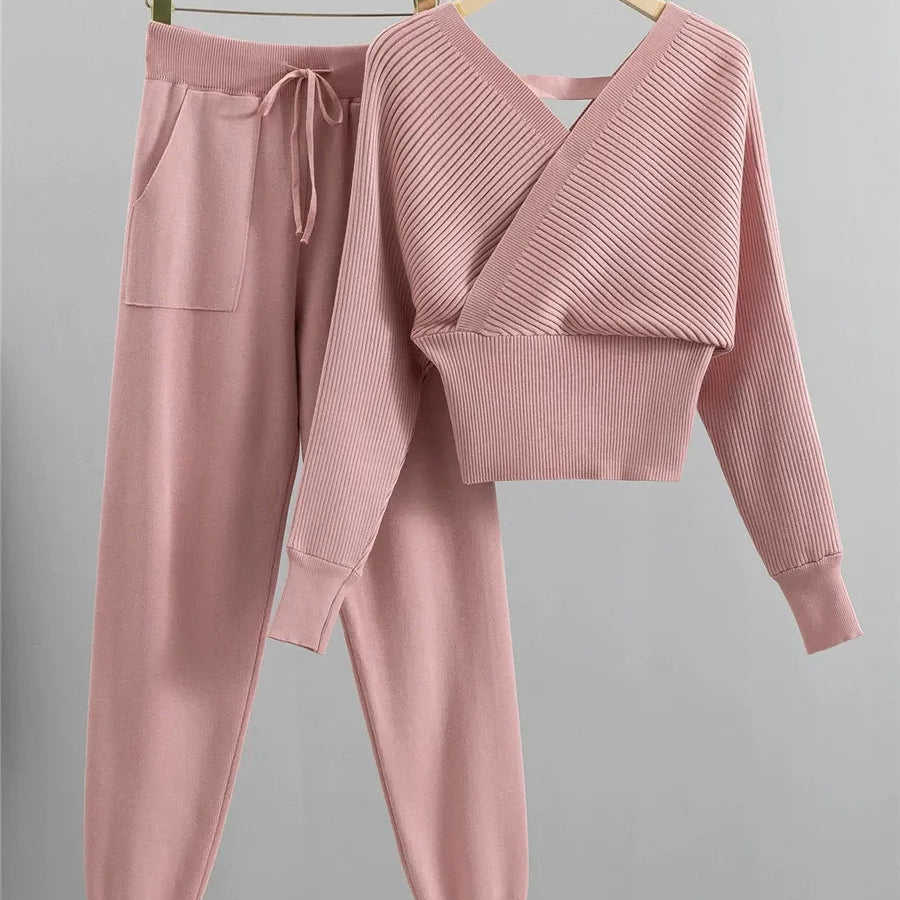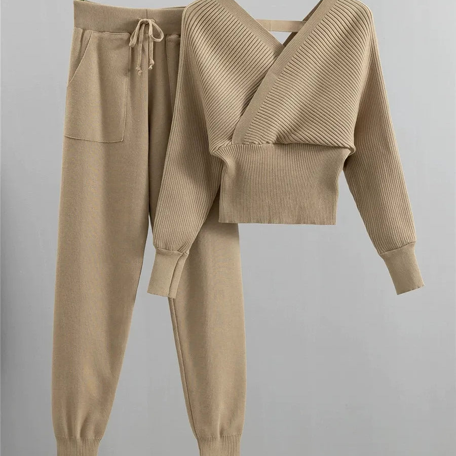 Dames Tweedelige Set – Ribgebreide Wrap Top – Slim Fit – Tapered Joggingbroek