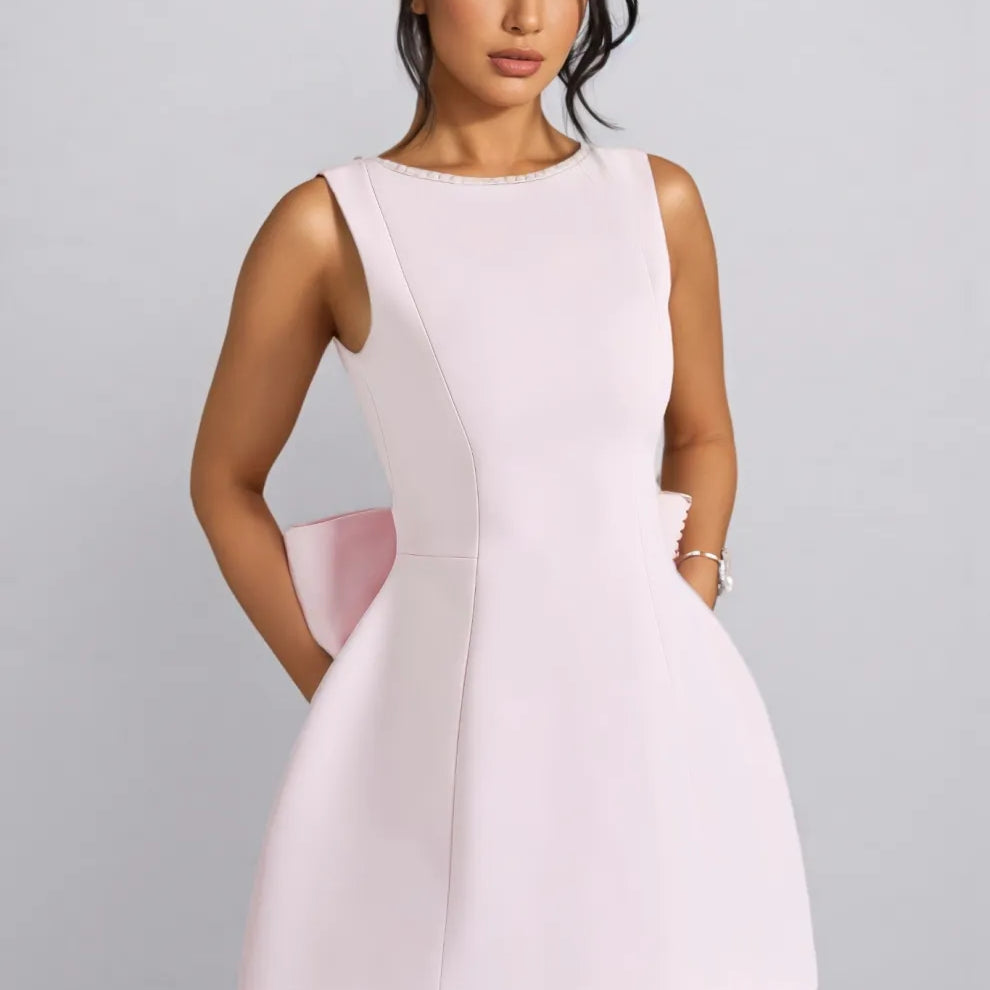 Ik wil een blije vrouw met een mooie jurk in beige achtergrond tinten