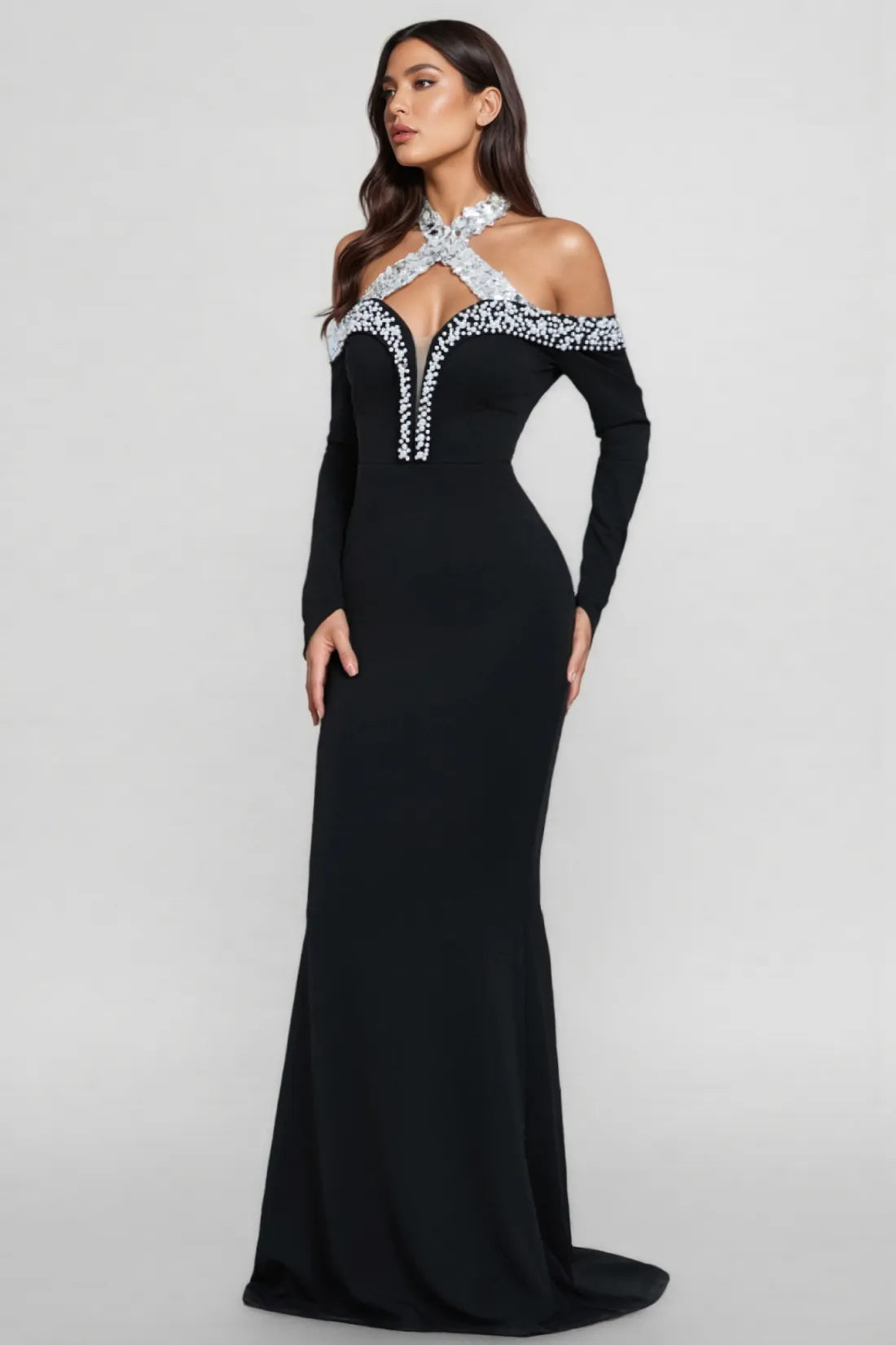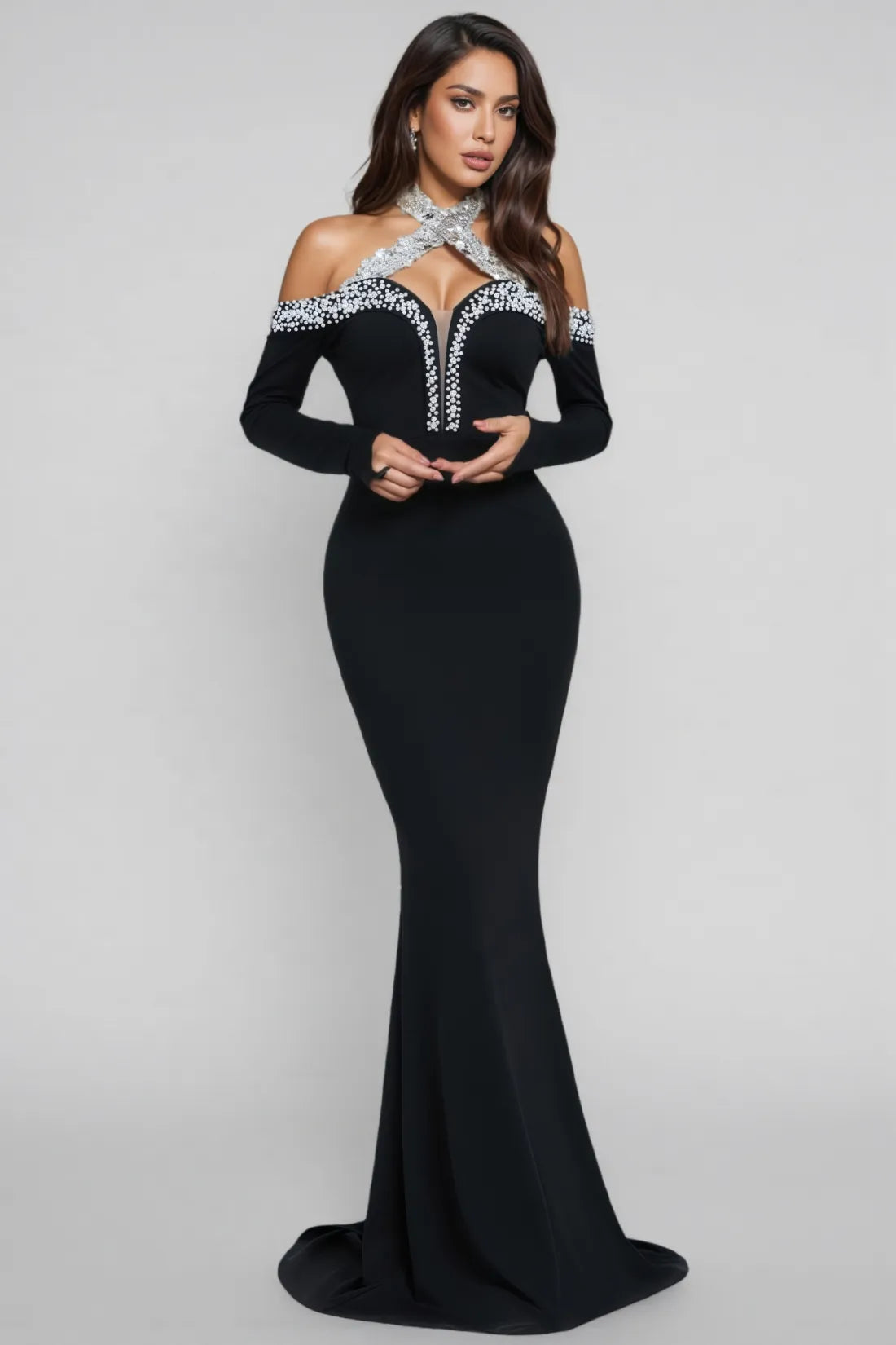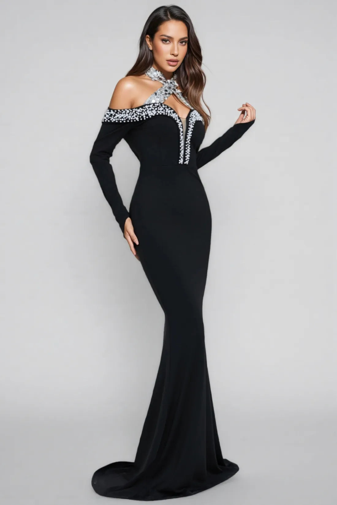 Hyxra Diamond Studded Fishtail Maxi Dress