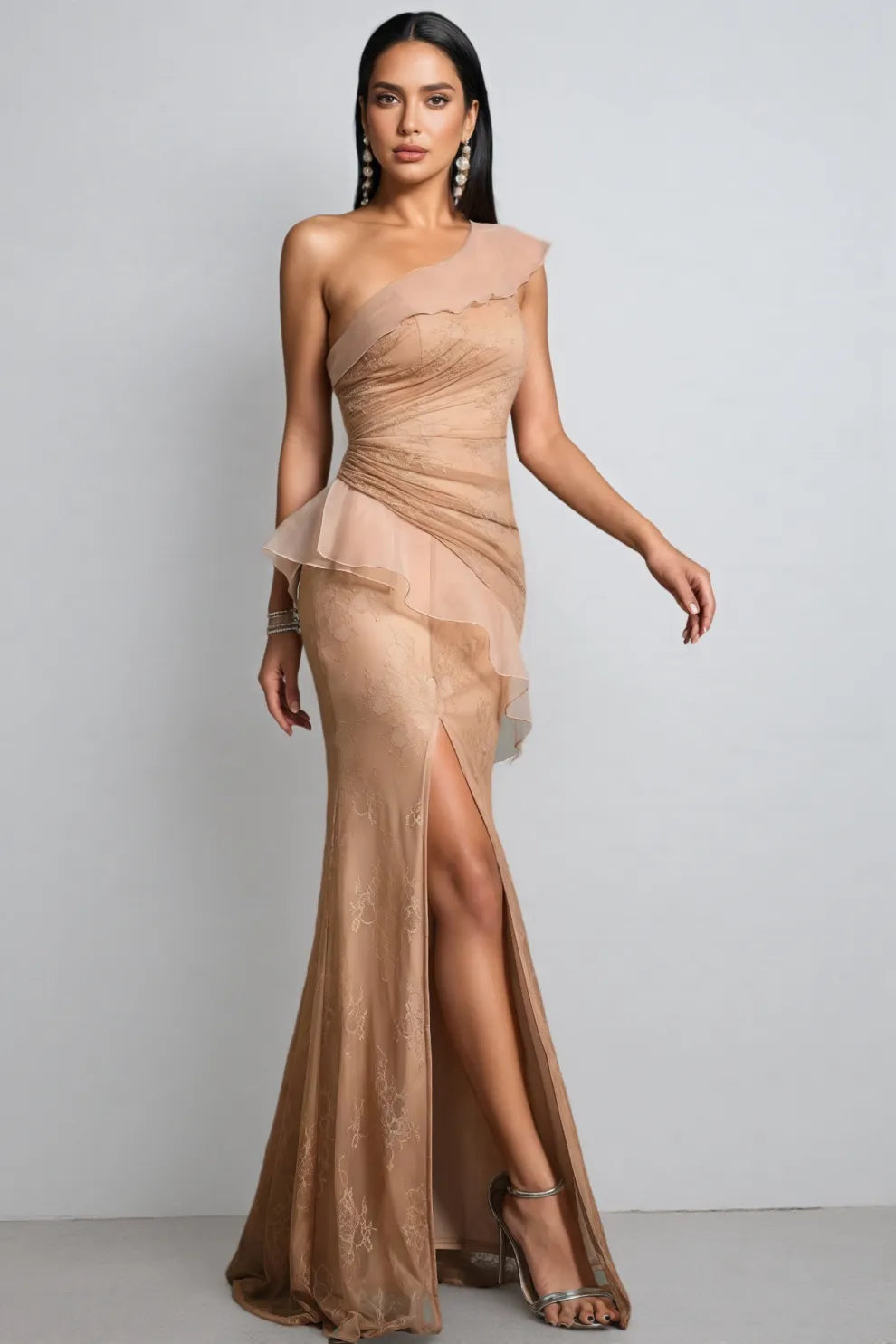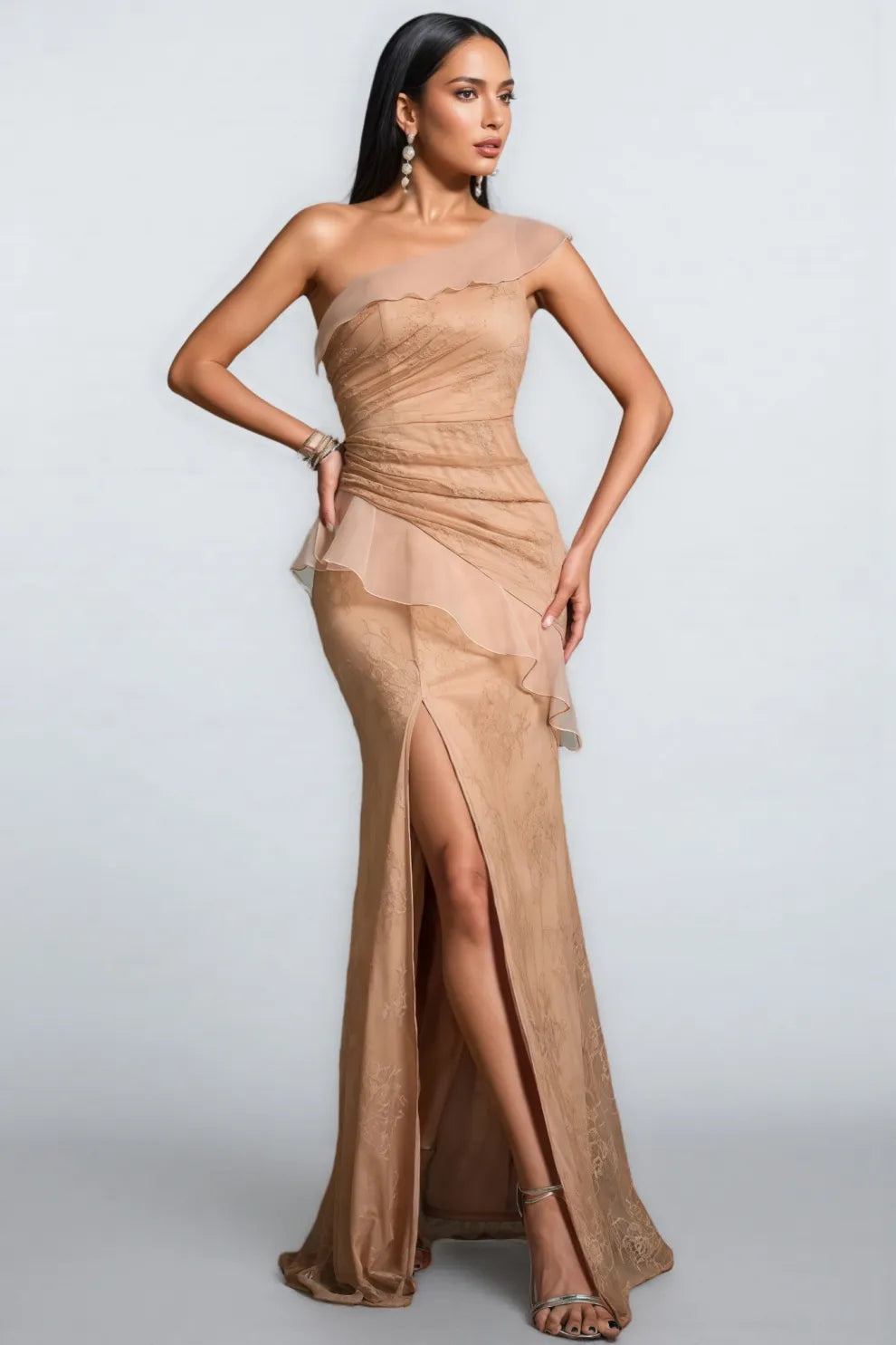Royalty One-Shoulder Fishtail Slit Maxi Dress